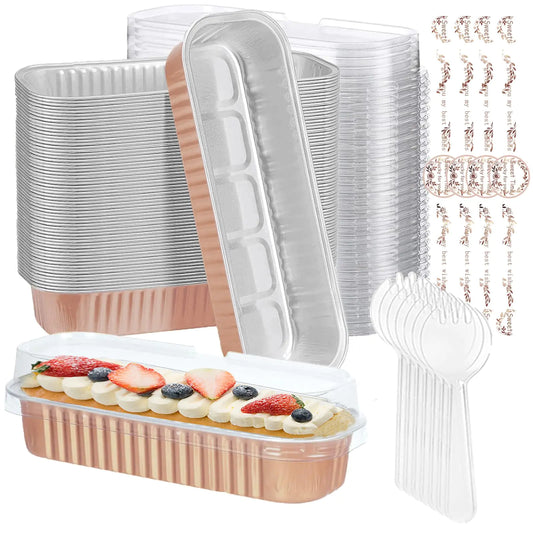 chilsoby 100 Pack Mini Cake Pans with Lids and Spoons6.8oz Mini Loaf Pans with Lids Mini Cake Tins Rectangular Aluminum Foil Baking Pans with Sealing Sticker Mini Cheesecake Containers