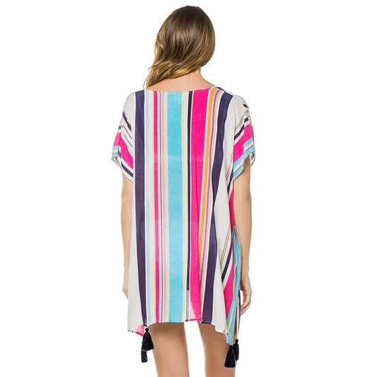 2024 Boho Yellow Striped Print Hand-knit V Neck Bat Sleeve Dress Summer Women Beachwear Swimsuit Cover Up Loose Kaftan Q1588