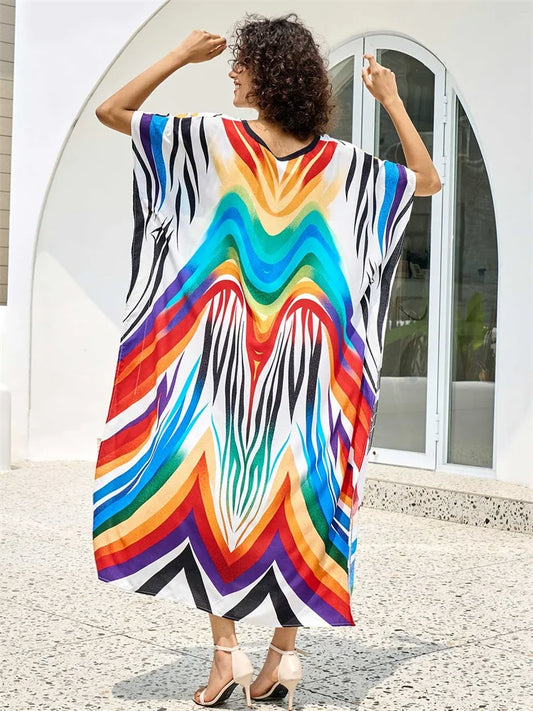 2025 Boho Colorful Wave Printed V-neck Bat Sleeve Beach Dress Women Summer Swimwear Coverup Cozy Plus Size Kaftan Homewear Q1674