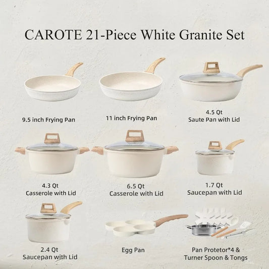 CAROTE 21-Piece Nonstick Pots & Pans Set, White Granite Induction Cookware