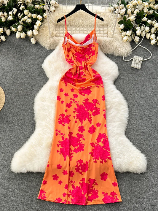 SINGREINY Spaghetti Strap Floral Long Dress - Slim Bodycon Design