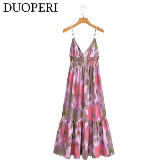 DUOPERI Printed V-Neck Backless Midi Dress - Casual Long Dress