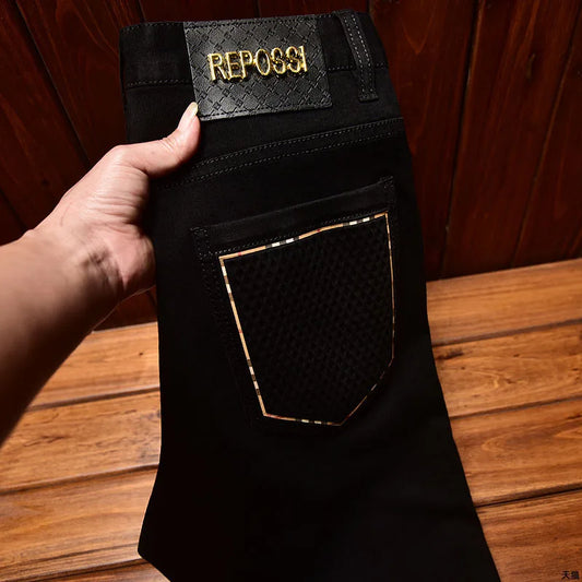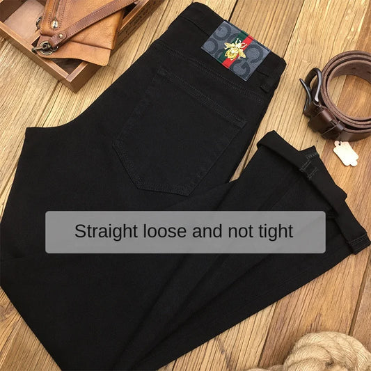 High-End Pure Black Straight Jeans - Men's Stretch Casual Trousers