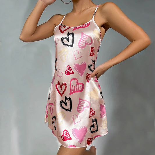Heart Letter Print Nightdress - Round Neck Spaghetti Strap Sleep