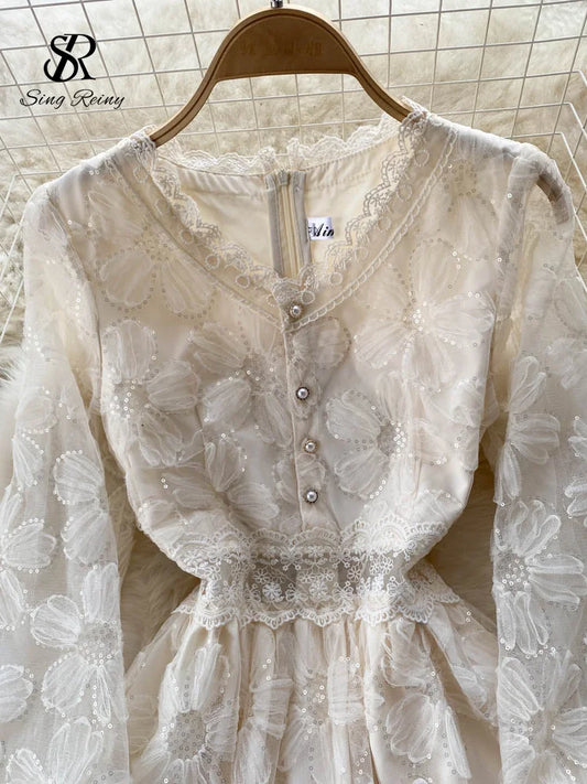 Vestido largo de encaje estilo francés SINGREINY - Vestido playero de verano con escote en V