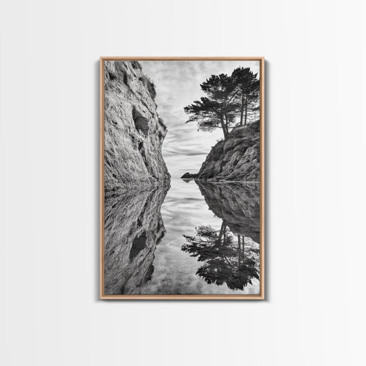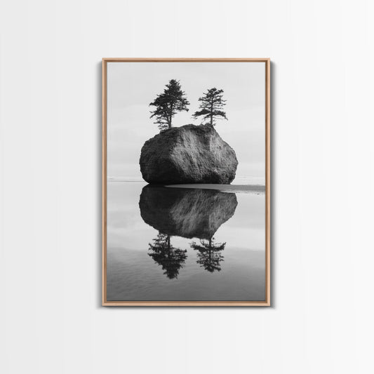 Island Reflection, Twin Trees, Still Water, Minimal Seascape, Zen Decor, Black and White Art