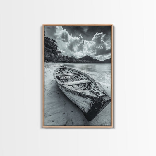 Abandoned Rowboat, Tropical Coastline, Vintage Travel Vibes, Black and White Canvas Print, Beach House or Coastal Living Wall Art
